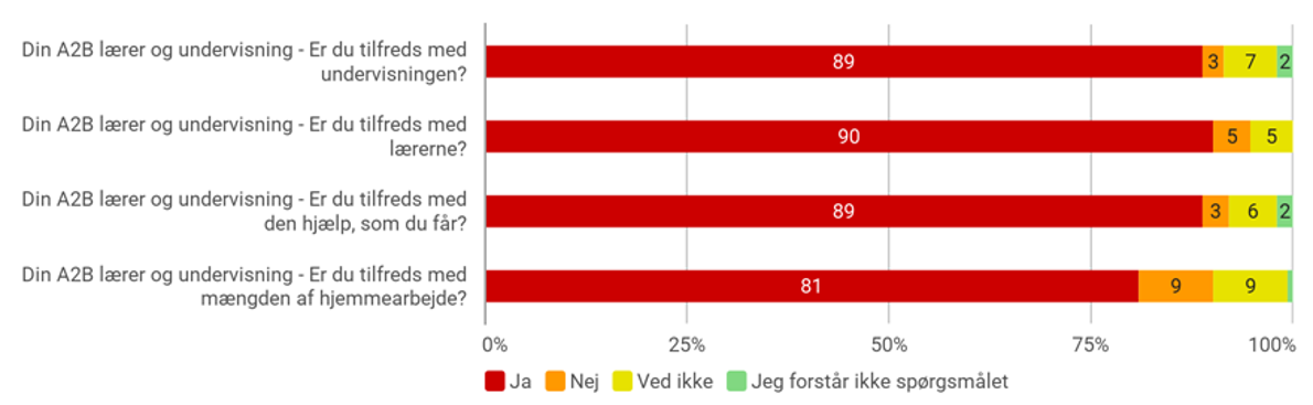 We conduct a satisfaction survey among candidates at A2B Language Center Aarhus twice a year. The following results are excerpts from the satisfaction survey from Spring 2025.